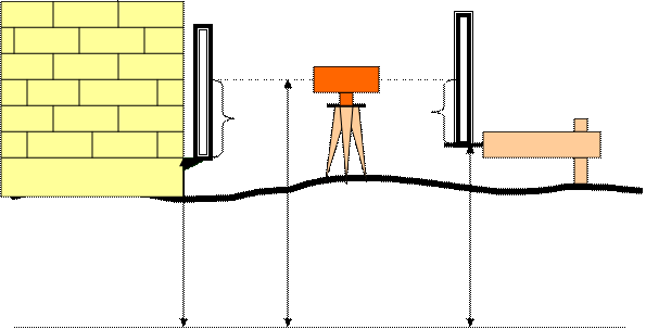 Последним видом геодезических работ при нулевом цикле строительства является вынос на цоколь здания продольных и поперечных осей и нулевого горизонта. Оси выносят с помощью теодолита со створных точек и обозначают вертикальными штрихами на цоколе. Поскольку стен первого этажа еще не существует, то отметку чистого пола первого этажа (нулевой горизонт) выносят также на цоколь, уменьшив ее на целое число десятков сантиметров, и закрепляют горизонтальным штрихом или стенной маркой (очень редко). Эту задачу легко понять из рисунка 100.