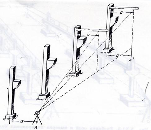 Рис. 101. Контроль за вертикальностью ряда колонн способом
