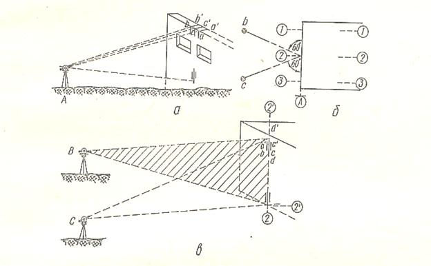 После возведения первого этажа на него передают основные оси. Зрительной трубой теодолита, установленного над одной из створных точек, визируют на вертикальную риску цоколя, обозначающую ось здания, и, наклоняя зрительную трубу объективом вверх, проектируют ее на второй этаж. Переводят трубу через зенит и повторяют проектирование. Расстояние между двумя полученными проекциями делят пополам и проводят вертикальный индекс, который будет обозначать один конец основной оси.