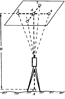 -визируют вверх (ось лотаппарата направляют вверх поворотной призмой) и на пластине отмечают карандашом или иглой пересечение нитей каждый раз при повороте зрительной трубы на 90 (4 положения), в результате чего получают на пластине 4 проекции точки, над которой поставлен прибор;