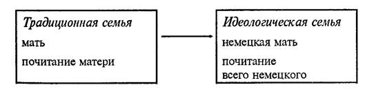 В результате на первое место выходит почитание "немецкого", где мать выступает в качестве всего лишь еще одной возможности построения единообразной системы понимания действительности. Она упрощает действительность, сведя ее к единой доминанте. Если для немецкой схемы такой доминантой была "немецкость" ("арийскость"), то Для советской схемы ею становится отсылка на "партию": "Партия — наш рулевой", "Партия — ум, честь и совесть", "Слава КПСС" и т.п. Высказывания типа "Наша цель —