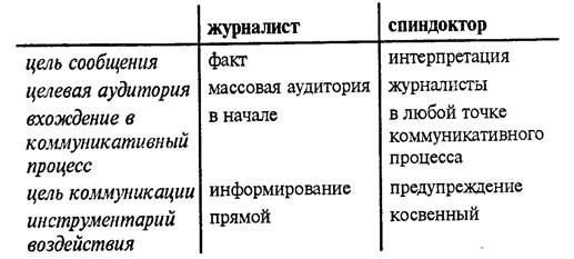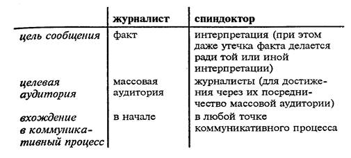Следует признать определенное несовпадение функционирования спиндоктора и журналиста, что можно выразить с помощью следующей таблицы: