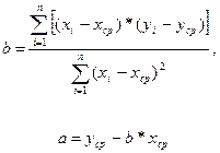 Для оценки параметров a и b линейной парной регрессии с использованием имеющегося набора результатов наблюдений наиболее часто используют метод наименьших квадратов (МНК), который минимизирует сумму квадратов εi - отклонения результатов наблюдений yi от рассчитанных по линейной модели (2.3) значений yрi: