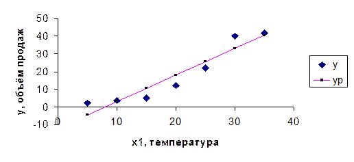 По данным, приведённым в Примере 1, построим линейную модель для объёма продаж мороженного y в зависимости от температуры воздуха x1. Промежуточные данные вычислений и модельные значения yр приведены в Таблице 2.