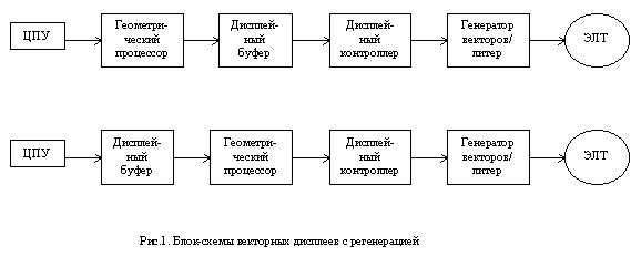 Для векторных дисплеев используется геометрический процессор (рис.1, первая схема). Геометрические данные, посылаемые ЦПУ графическому дисплею, обрабатываются до сохранения в дисплейном буфере, содержащий только те инструкции, которые необходимы генератору для вывода изображений. Контроллер считывает информацию из дисплейного буфера и посылает генератору. При достижении конца дисплейного буфера контроллер возвращается на его начало, и цикл повторяется снова.