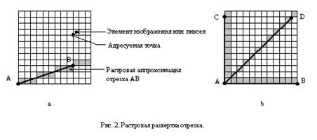 Растровое устройство рассматривается как матрица дискретных ячеек (точек), каждая из которых может быть подсвечена, т.е. является точечно-рисующим устройством. Невозможно непосредственно нарисовать отрезок прямой из одной адресуемой точки или пиксела в матрице в другую адресуемую точку. Отрезок можно только аппроксимировать последовательностями точек (пикселов), близко лежащих к реальной траектории отрезка. Эту идею иллюстрирует рисунок 2.