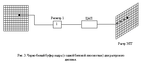 Чаще всего для графических устройств с растровой ЭЛТ используется буфер кадра. Буфер кадра представляет собой большой непрерывный участок памяти компьютера. Для каждой точки или пиксела в растре отводится как минимум один бит памяти. Эта память называется битовой плоскостью. Для квадратного растра размером 512х512 требуется 218, или 262144 бита памяти в одной битовой плоскости. Из-за того, что бит памяти имеет только два состояния (двоичное 0 или 1), имея одну битовую плоскость, можно получить лишь черно-белое изображение. Битовая плоскость является цифровым устройством, тогда как растровая ЭЛТ - аналоговое устройство. Поэтому при считывании информации из буфера кадра и ее выводе на графическое устройство с растровой ЭЛТ должно происходить преобразование из цифрового представления в аналоговый сигнал. Такое преобразование выполняет цифро-аналоговый преобразователь (ЦАП). На рисунке 3 приведена схема графического устройства с черно-белой растровой ЭЛТ, построенного на основе буфера кадра с одной битовой плоскостью.