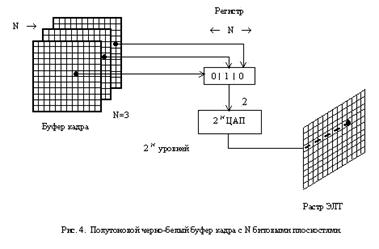 Интенсивность каждого пиксела на ЭЛТ управляется содержимым соответствующих пикселов в каждой из N битовых плоскостей. В соответствующую позицию регистра загружается бинарная величина (0 или 1) из каждой плоскости. Двоичное число, получившееся в результате, интерпретируется как уровень интенсивности между 0 и 2N- 1. Буфер кадра с тремя битовыми плоскостями для растра 512х512 занимает 786432 (3*512*512) битов памяти.