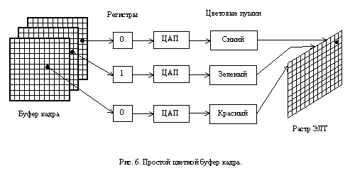Поскольку существует три основных цвета, можно реализовать простой цветной буфер кадра с тремя битовыми плоскостями, по одной для каждого из основных цветов. Каждая битовая плоскость управляет индивидуальной электронной пушкой для каждого из трех основных цветов. Три основных цвета, комбинируясь на ЭЛТ, дают восемь цветов. Схема простого цветного растрового буфера показана на рисунке 6. Чтобы увеличить количество цветов для каждой из трех цветовых пушек используется дополнительные битовые плоскости.