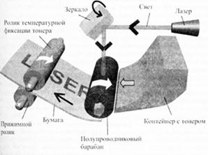 В лазерных принтерах используется электрографический принцип создания изображения. Процесс печати включает в себя создание невидимого рельефа электростатического потенциала в слое полупроводника с последующей его визуализацией. Визуализация осуществляется с помощью частиц сухого порошка - тонера, наносимого на бумагу. Тонер представляет собой частички железа, покрытые пластиком. Наиболее важными частями лазерного принтера являются полупроводниковый барабан, лазер и прецизионная оптико-механическая система, перемещающая луч.
