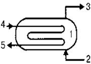 1-котел-утилизатор, 2 — подача воды, 3 — выход пара, 4 — вход нагретого газа. 5 — выход охладившего газа