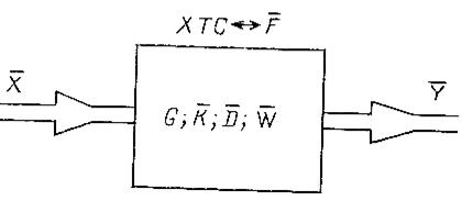 n Х-вектор входных переменных; Y-вектор выходных переменных, или переменных состояния ХТС; G-технологическая топология; К'- вектор конструкционных параметров; D-вектор технологических параметров W-вектор параметров технологического режима;F-векторная функция; <-> -математический символ «соответствие»