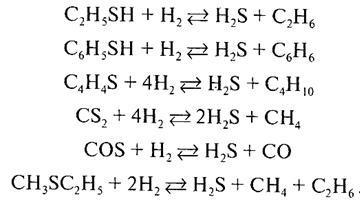 На первой стадии сераорганические соединения гидрируются с использованием алюмокобальтмолибденового или алюмоникельмолибденового катализатора при температуре 350—400 оС и давлении 2-4 МПа. При гидрировании протекают следующие реакции: