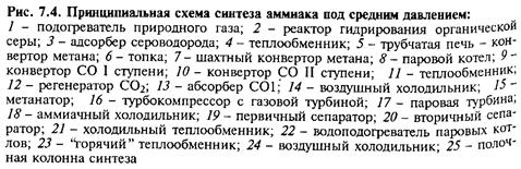 •схема синтеза аммиака под средним давлением включает в себя двухступенчатую конверсию метана водяным паром, а затем кислородом атмосферного воздуха