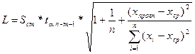 Вероятность реализации точечного прогноза практически равна нулю. Поэтому в дополнение к точечному прогнозу рассчитывается средняя ошибка прогноза или доверительный интервал прогноза с достаточно большой надёжностью. Размах прогнозного интервала L зависит от стандартной ошибки (3.8), удаления xпрогн от своего среднего значения в ряде наблюдений xср, количества наблюдений n и уровня значимости прогноза α: