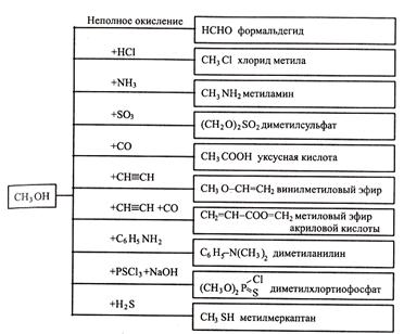 Метиловый спирт широко применяют как растворитель, как высокооктановую добавку к моторному топливу, в производстве лаков, красителей. Кроме того, его используют в каче стве сырья для многих важных органических продуктов, показанных на схеме