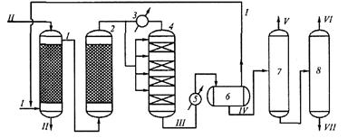 1 - скруббер; 2 - адсорбер; 3 - теплообменник; 4 - колонна синтеза; 5 - холодильник; 6- сепаратор; 7, 8- ректификационные колонны; /- синтез-газ; //- вода; Щ- реакционные газы; IV- метанол-сырец; V'- диме-тиловый эфир; VI -метанол; УП- высшие спирты