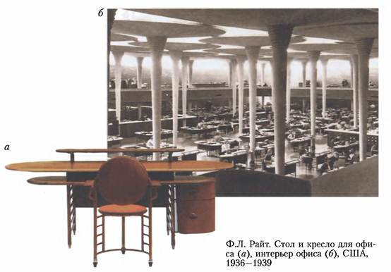 Рис.2.3. Ф.Л. Райт. Стол и кресло для офиса (а), интерьер офиса (б), США, 1936-1939