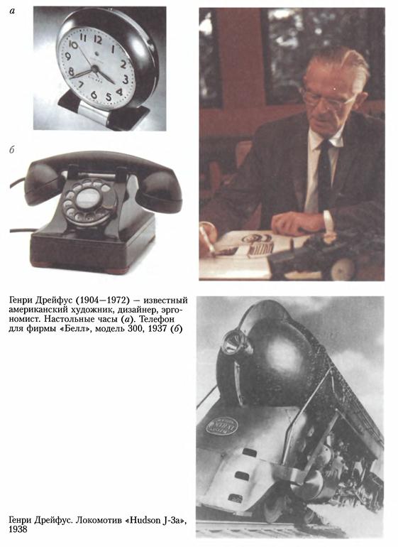 | Бытовая техника и железнодорожный транспорт, дизайнер, художник, эргономист Генри Дрейфус | Написал первое пособие для дизайнеров по эргономике | Дизайн часов, телефона, локомотива (1937-1938 гг.). Павильон «Демократия2 Нью-Йорк, 1949 г. |