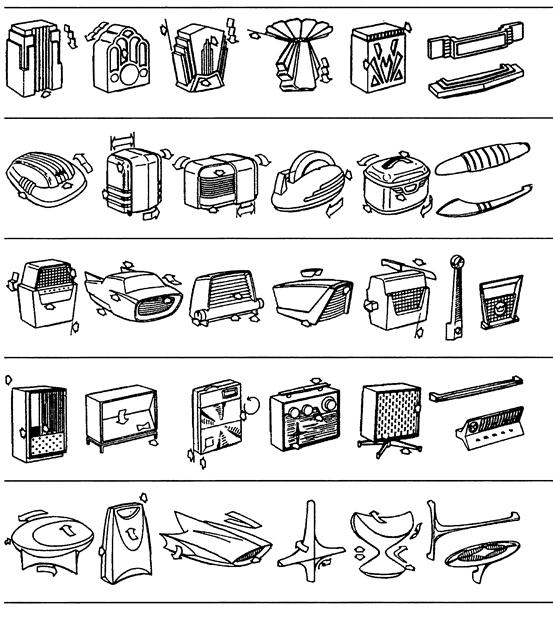 Рис.2.14. Дж. Джексон, США, 1959. Схема формирпования пяти ведущих стилей в промышленной продукции 1930-1950-х годов: трапециевидный, аэродинамический, конусный, ящичный и скульптурный стили (стайлинг).