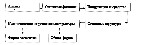 Следующей ступенью является определение структуры. В синтезе изделия эта очень важная ступень разделена на ряд шагов, начиная с деления требуемой функции на подфункции. Затем следует изучение возможных средств реализации подфункций, сочетание их в основной структуре и, наконец, адаптация в количественно определенной структуре, где решающие параметры оптимизированы и где определено относительное расположение элементов. Форма рассматривается в двух параллельных ветвях, поскольку общая форма и формы составляющих элементов определяются одновременно. Подробная форма элементов включает спецификацию материалов, размеров и поверхностей.