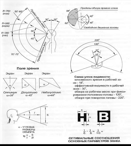 Чтобы оператор мог видеть всю информацию на пульте управления необходимо учитывать поле зрения человека в горизонтальной плоскости (рис.5.2) и при наклонах его головы [2].