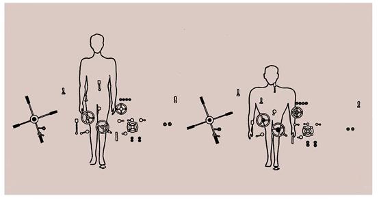 Усредненные значения размеров женщины примерно на 10 % меньше, чем у мужчин. Метод схематического изображения (рис.5.3.) человеческого тела в технической или иной документации при решении проблемы выбора соотношений между пропорциями человеческой фигуры и размерами рабочего места называется соматографией. (греч. somatog – тело и графия)