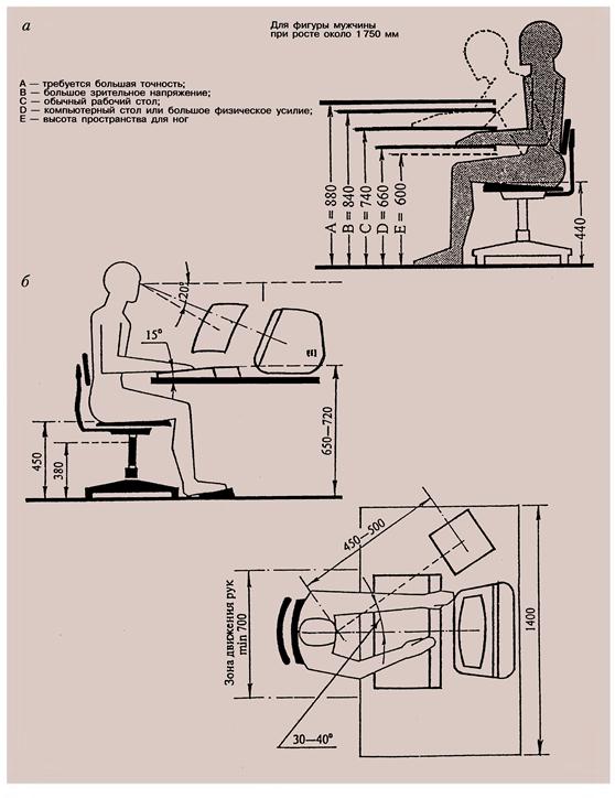 На рис. 5.5 приведены различные типы пультов оператора и организация его рабочего места с указанием основных размеров, обеспечивающих удобство работы человека.