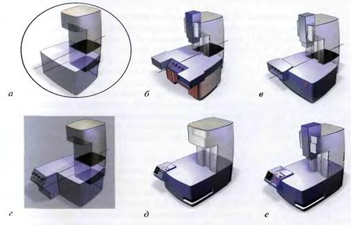 Типичная для многих станков условная модель (рис. 7.8, а) –симметричная. Модель на рис. 7.8, б – развитая исходная форма с усиленной симметрией. На рис. 7.8, в появился асимметричный элемент, который еще не вызывает нарушения симметричной в основе формы станка. На рис. 7.8, г выступ настолько активный, что асимметричное включение перешло некоторый допустимый предел и противоречит симметричной основе композиции. Уравновесить композицию с односторонне развитым объемом можно, например, путем уменьшения значимость этого объема и смещения колонны в противоположную сторону. Форма станка на рис. 7.8, д в результате таких операций стала асимметричной. Асимметричность может быть поддержана в развита дополнительными деталями. Но появление асимметричной композиции достаточно сильной местной оси симметрии может также вызвать противоречие, как это случилось со станком на рис. 7.8, с, в котором часть стала слишком независимой.