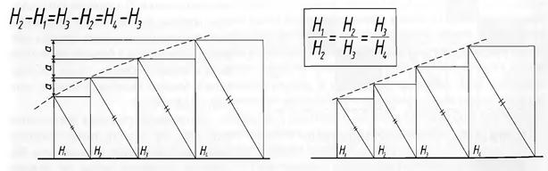 Сочетание различных геометрически подобных элементов даёт различные виды пропорциональных отношений арифметических (типа Н2 – Н1 = Н3 – Н2) или геометрических (рис.7.10).