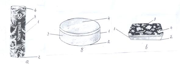 Рис. 13.4. Упаковка в виде: тубуса со скошенной передней и задней гранями (поз.а); круглой коробки для печения (поз.б); плоской коробки (поз.в)