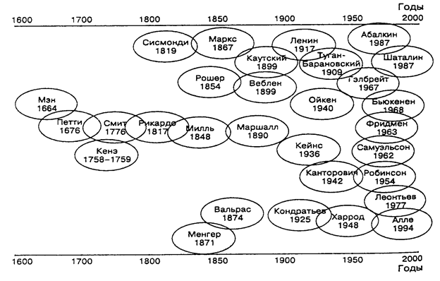 Овалы, в которые вписаны имена экономистов, размещены в соответствии с временными периодами их творческой деятельности (примерными сроками публикаций основных трудов) и условным распределением по школам и направлениям.