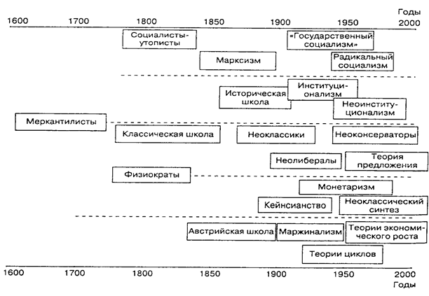 Схема 3 дает представление о периодизации основных теорий и школ в экономической науке, их взаимосвязи и преемственности во временных рамках.