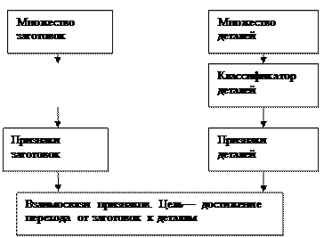 Рассмотрим схему на рис. 4.1 более подробно. При большой номенклатуре деталей необходимо упорядочить множество заготовок, из которых будут изготовлены детали, т.е. представить эти множества в виде классификаторов с соответствующими признаками.