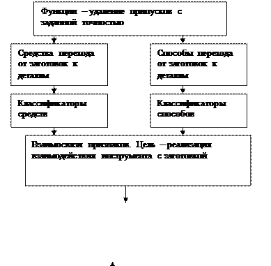 Удаление припусков надо осуществить с заданной точностью, допустимой шероховатостью, с требуемым взаимным расположением элементов на детали и т.д. Функцию удаления припусков можно реализовать различными способами и средствами. В общем случае таких возможностей достаточно для того, чтобы построить классификаторы способов и средств. На основании анализа признаков выбранных способов и средств удаления припусков ставится цель – реализация взаимодействия инструмента с деталью.