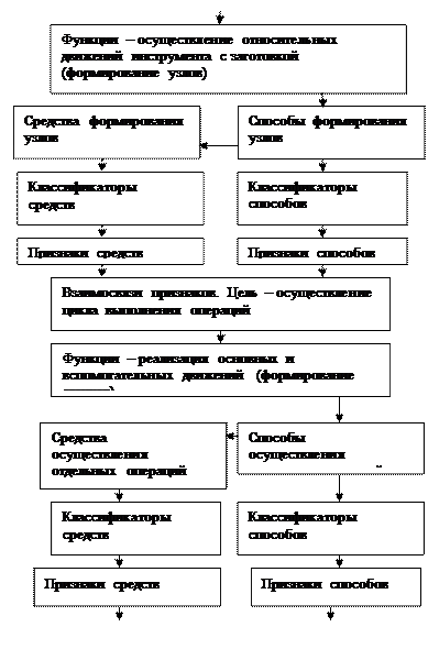Каждая ступень иерархии может иметь дополнительный объем подзадач, классификаторов, вариантов решений. Например, на второй ступени, в связи с реализацией относительных движений инструмента и заготовки, надо анализировать также способы и средства фиксации и зажима инструмента, детали, которые следует рассматривать во взаимосвязи с другими элементами.
