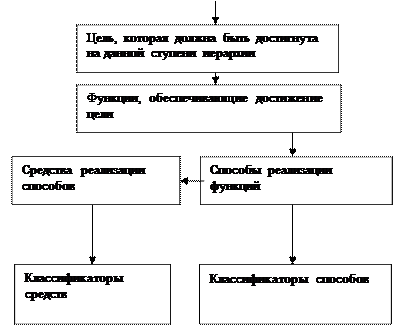 Каждая ступень иерархии реализует свою цель, которая обеспечивает требуемую направленность действий для получения конечного результата, а также определяет состав способов и средств осуществления взаимосвязей элементов данной ступени иерархии. Цели ступеней иерархии взаимосвязаны (имеет место определенная система целей), однако сочетание критериев, характеризующих оптимальный вариант решения, для ступеней может различаться.