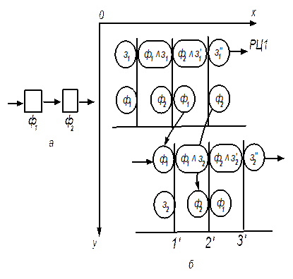 Связи РЦ1 и РЦ2, характеризующие внутренние процессы, показывают, что переход станка Ф1 в нерабочее состояние после обработки З1 (в РС кружок Ф1 касается вертикальной линии перехода слева) в РЦ2 является условием, обеспечивающим переход к обработке следующей заготовки З2. Поэтому кружок Ф1 должен касаться линии перехода справа. Кроме Ф1 и Ф2, других функциональных элементов в схеме не предусмотрено, и в РЦ1 и в РЦ2 Ф2 касаются одной и той же вертикальной линии с разных сторон, т.е. окончание обработки станком Ф1 заготовки З1 происходит одновременно с началом обработки фазой Ф1 заготовки З2. Если бы работали дополнительные функциональные элементы, то начало нового перехода было бы смещено на более позднее время. Последнее необходимо определять на алгоритмическом уровне. Такое смещение возможно и в рассматриваемой схеме при наличии подготовительных работ на станке Ф1 перед началом обработки заготовки.
