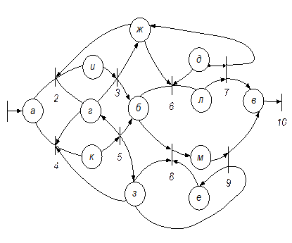 На рис. 6.2 отражены следующие условия: a – заказ прибыл и ожидает М2; б – заказ обработан на М1 и ожидает обработки на М2 или М3; в – заказ выполнен; г – М1 не занят; д – М2 не занят; е – М3 не занят; ж – F1 не занят; з – F2 не занят; и – на М1 воздействует F1; к – на М1 воздействует F2; л – на З1 воздействует М1; н – на М3 воздействует F2. Обозначены следующие переходы: 1 – заказ поступил; 2 – начало работы оператора F1 на М1; 3 – конец работы оператора F1 на М1; 4 –начало работы оператора F2 на М2; 5 – конец работы опера- тора F2 на М1; 6 – начало работы оператора F1 на М2; 7 – конец работы оператора F2 на М2; 8 – начало работы оператора F2 на М3; 9 – конец работы оператора F2 на М3; 10 – дальнейшее движение заказа.