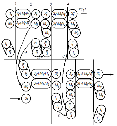 По логике событий окончание работы станка Ф1 над первой заготовкой – это условие перехода к обработке заготовки З1. В РЦ2 вертикальная линия 1 характеризует переход к обработке станком Ф1 заготовки З2. Справа от вертикальной линии Ф1 посредством кружка Ф1