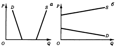 На рис. 12б цена спроса меньше цены предложения при любом неотрицательном объеме выпуска, сумма денег, которую потребители готовы заплатить за данный товар, недостаточна, чтобы компенсировать затраты на его производство. Производство такого товара технологически вполне возможно, но экономически нецелесообразно. Так, можно сделать автомобиль из чистого золота или мусорный бак из серебра, но продать эти товары будет весьма не просто. В этом случае считают, что равновесие существует при нулевом равновесном объеме (Q = 0), если цена предложения при этом объеме больше цены спроса.