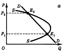 На рис. 13а линия спроса имеет нормальный вид. В то же время линия предложения меняет знак наклона при росте цены, что приводит к существованию двух положений равновесия – в точках Е 1 и Е 2. Считается, что такая «загибающаяся» кривая предложения характерна для трудовых ресурсов. Кривая предложения имеет положительный наклон при относительно низком уровне заработной платы, т.е. увеличение последней стимулирует увеличение предложения труда. Однако если уровень заработной платы продолжает расти, достигается точка, за которой рабочие предпочитают свободное время увеличению дохода.