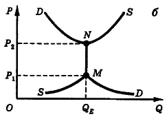 На рис. 13б представлен случай, когда линии спроса и предложения совпадают на отрезке NM. Равновесие на рынке достигается при любой цене в диапазоне от P 1 до P 2 и равновесном объеме QE. Изменение цены в указанном диапазоне недостаточно чувствительно, чтобы вызвать у потребителей изменение объема спроса, а у производителей – изменение объема предложения. Этот случай имеет физическую аналогию в виде равновесия шара на горизонтальной площадке: равновесие возможно в любой точке этой площадки.