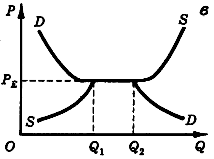 На рис. 13в линии спроса и предложения также имеют общий отрезок: в этом случае равновесие устанавливается при любом объеме в интервале от Q 1 до Q 2 и равновесной цене РЕ. Изменение объема в этом интервале не вызывает изменения цены спроса и равной ей цене предложения.