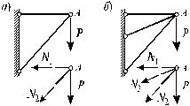 На рис. 2.5, а изображен кронштейн, состоящий из двух стержней, шарнирно скрепленных между собой. В связи с тем, что на конструкцию действует лишь вертикальное усилие Р, а система является плоской (т.е. все элементы конструкции и вектор внешних сил лежат в одной плоскости), получается, что усилия в стержнях легко определяются из условий равновесия узла А, т.е.