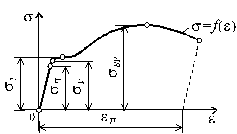 правило, экспериментально определяют диаграмму растяжения в координатах s и e (рис. 2.9), На диаграмме отмечены характерные точки. Дадим их определение.