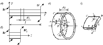 Для построения эпюры крутящих моментов Mz применим традиционный метод сечений - на расстоянии z от начала координат рассечем брус на две части и правую отбросим (рис. 4.1, б). Для оставшейся части бруса, изображенной на рис. 4.1, б, составляя уравнение равенства нулю суммы крутящих моментов S Mz = 0, получим: