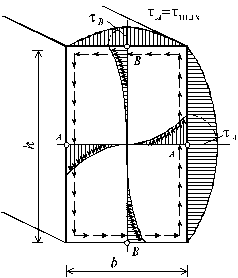 На рис. 4.3 показана, полученная методом теории упругости, эпюра касательных напряжений для бруса прямоугольного сечения. В углах, как видно, напряжения равны нулю, а наибольшие их значения возникают по серединам больших сторон: