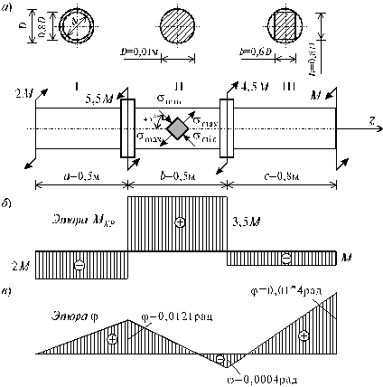 Стальной валик переменного сечения, испытывающего кручение, закручивается крутящими моментами, действующими в двух крайних и двух пролетных сечениях. Расчетная схема валика, ее геометрические размеры, величины и точки приложения внешних крутящих моментов указаны на рис. 4.4, а.