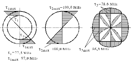 4. Построить эпюры касательных напряжений по сечениям вала, отметив на сечениях опасные точки. Касательные напряжения в точках поперечного сечения валика определяются по формулам: